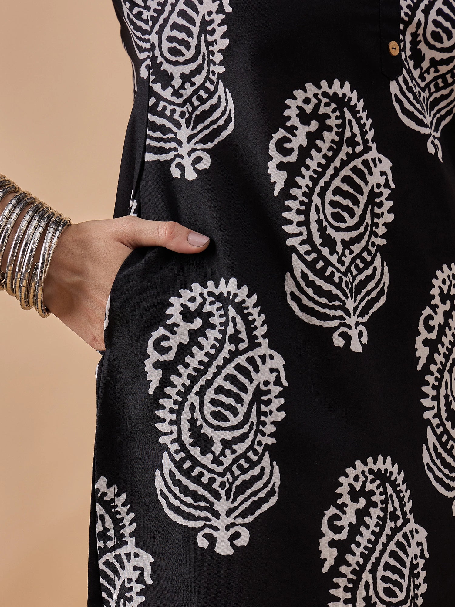 Make a bold style statement with this elegant Black & White Printed Kurta. Crafted from soft and breathable poly rayon fabric, this kurta is lightweight, flowy and perfect for all-day comfort. The striking white ethnic paisley print on a black base gives it a classy, timeless look.